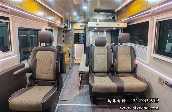 得益于方正的車身,車內(nèi)空間非常寬敞,內(nèi)寬可達2米。布局方面從前往后依次是駕駛區(qū)、乘坐區(qū)、生活區(qū)和尾部的廚衛(wèi)區(qū)域。整車核載5人,車廂中部采用2+1座椅布局,全部帶有扶手和頭枕,乘客座椅全部朝前設計,增加了乘坐的舒適度。