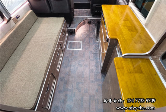 單人座椅后方是中置上客門,在后方是一體式櫥柜,下方帶有儲物抽屜,上方暗藏了一臺家用變頻空調(diào),乘客門上方也提供了多個儲物吊柜,儲物空間充足。櫥柜旁鑲嵌了一臺108L上下雙開門的冰箱,上方則是一臺微波爐,側(cè)面的壁板上還帶有電源插座。