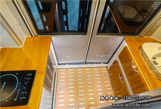 車輛尾部是獨立的廚衛(wèi)區(qū)域,可以通過移門跟生活區(qū)隔開,最大限度的降低油煙干擾和保證衛(wèi)浴間的隱私。后對開門設計,車內(nèi)布局還可以根據(jù)自己的喜好,個性化定制。