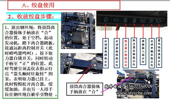 2、收鋼絲繩:拉上駐車制動受控閥,并用木塊,石頭掩住車輪,將鼓筒離合器操縱機構手柄放在“合”的位置,變速器處于空檔 ,起動發(fā)動機,踏下離合器踏板,接通遠距離控制開關(此時蜂鳴器叫),按下取力器自鎖開關,同時轉(zhuǎn)動手柄至“反”的位置,此時駕駛室頂蓋儀表指示燈亮“箭頭逆時針旋轉(zhuǎn)”圖案,表明取力器已掛上,此時慢慢松開離合器,平穩(wěn)加油,即可收卷鋼絲繩,開始牽引。牽引完后,踩下離合器踏板,按下取力器自鎖開關,同時轉(zhuǎn)動手柄至“0”的位置,將鼓筒離合器操縱手柄放在“離”的位置,關閉遠距離控制開關。