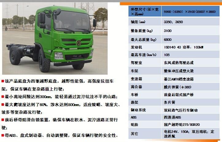 相關(guān)車型EQ2070GZ4DJ越野四驅(qū)底盤的詳細(xì)描述:該產(chǎn)品底盤為四驅(qū)越野底盤,越野性能強(qiáng),高強(qiáng)度抗扭車架,保證車輛在復(fù)雜路面上行駛時(shí),不會(huì)出現(xiàn)大梁斷裂等情況;最小離地間隙達(dá)到300mm,能輕易通過(guò)泥濘坑洼不平的山路;最大爬坡度達(dá)到了60%,適應(yīng)陡峭、坡度大、坡多等復(fù)雜路況行駛。前后橋帶防滑自鎖裝置,確保車輛在積水、泥濘道路正常行駛;帶ABS、盤式制動(dòng)器、自動(dòng)調(diào)整臂,保證車輛行駛的安全性。