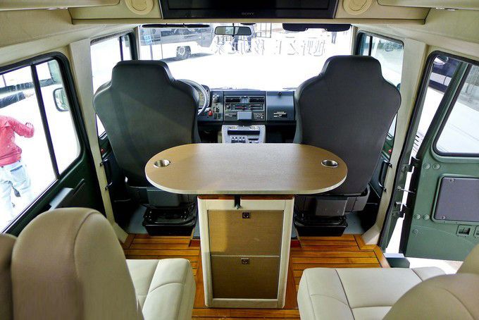越野房車內(nèi)飾:可以看到,柚木地板外加兩個(gè)電動(dòng)座椅與一個(gè)帶儲(chǔ)藏柜的可移動(dòng)多功能桌構(gòu)成了這輛越野房車的第二排。除此之外,頭頂上方安置有26寸索尼液晶電視和帶衛(wèi)星電視機(jī)頂盒的藍(lán)光播放器,微波爐烤箱、小型冰箱、電磁爐等常用設(shè)備也是一應(yīng)俱全,當(dāng)然恒溫式的出水系統(tǒng)以及真空馬桶、獨(dú)立淋浴也是一樣不少。具備天窗和側(cè)窗的尾箱處安置有兩張舒適的標(biāo)準(zhǔn)床鋪,可以說盡管這輛U5000并非加長(zhǎng)特裝版,但所有居住設(shè)備都很齊全。