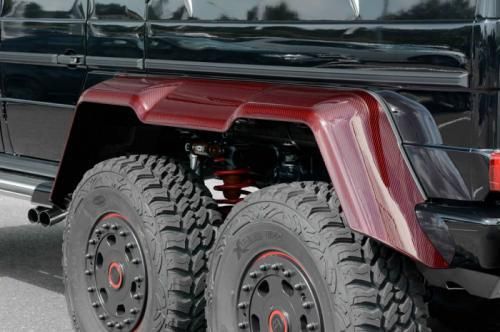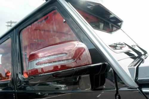 第一眼看去,這輛G63 AMG 6x6的涂裝會讓人感覺有些怪異。的確,這輛Brabus出品的六輪怪獸換上了紅色碳纖維車身改裝件,后視鏡蓋、輪眉以及引擎蓋都采用了紅色碳纖維材料。透過車窗我們能看到內(nèi)飾同樣是紅色主題,甚至是輪圈內(nèi)也有紅色點綴。